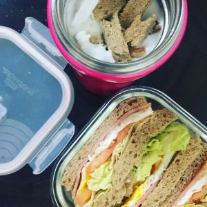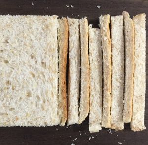 最后对半切开放入饭盒,明早带到公司去吃早餐!谁说我浪费面包边的???泡到酸奶里吃!特!别!美!味!