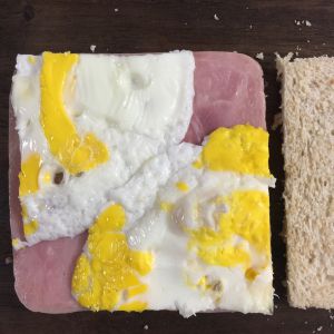 5火腿上面盖上鸡蛋,然后鸡蛋上面再盖上西红柿圆生菜等等⋯⋯想吃什么盖什么
