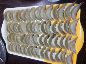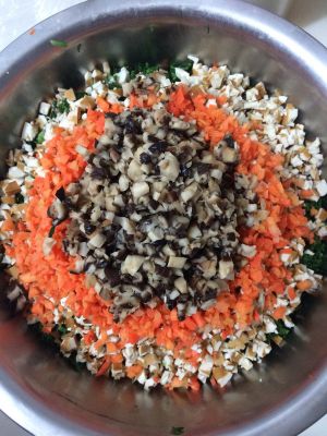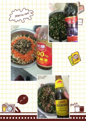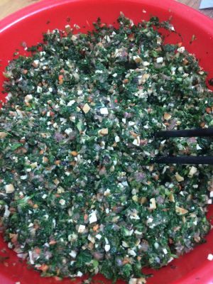 将所有菜包括五花肉分别切末,五花肉里放入料酒,盐,生抽少许,白糖少许,蒜蓉少许,剁成肉泥