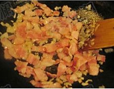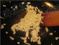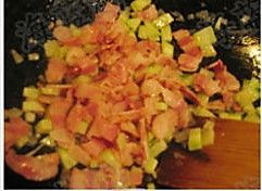 橄榄油少许入锅,加入洋葱炒香后加入切碎的培根翻炒,加入生抽。