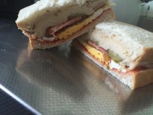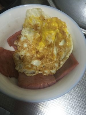 火腿or午餐肉之类的 切片煎至两面金黄 鸡蛋煎熟 备用