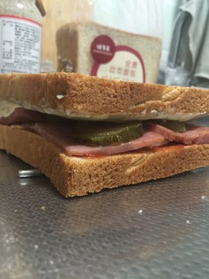 然后糊到面包片上 厚度自己控制 然后按照自己的喜好放好之前准备的食材~火腿啊 鸡蛋啊 酸黄瓜啊 来点儿新鲜蔬菜也行 你开心就好~