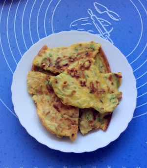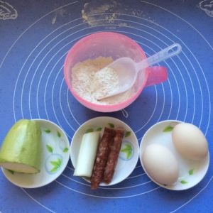 所有小饼用料。先把西葫芦擦丝放入盆中,加少许盐拌匀。香肠、大葱切末,入盆鸡蛋打入盆中,加入面粉、油(现在加油,煎的时候就