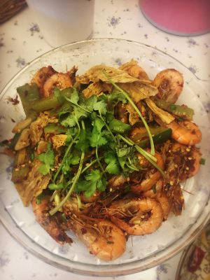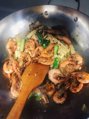 腐竹软了后放入虾翻炒这时候我加入辣椒籽。(其他用干辣椒的最好在放入蒜的时候就加入干辣椒翻炒。)
