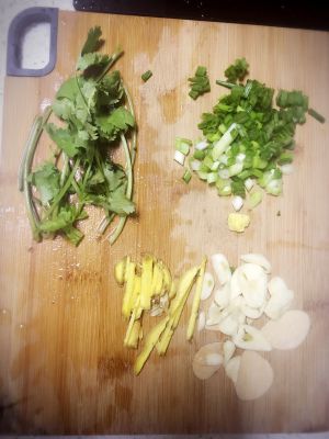 葱且成葱花、蒜切小片,姜切成丝、香菜洗净切段(要腐竹的把腐竹截小段,用开水泡一下备用)