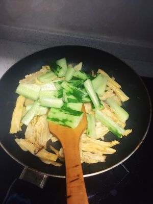 剩下的油放入葱姜蒜爆香,然后放入腐竹和黄瓜。翻炒。因为腐竹不容易烂。所以要放点水焖煮三分钟。
