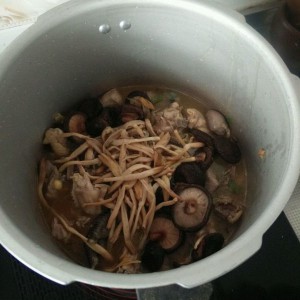 把炒好的鸡肉放入高压锅里,加入水,以刚刚漫住菜为宜;加入香菇,黄花菜,盐适量。ok,高压锅运作起来吧~