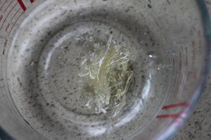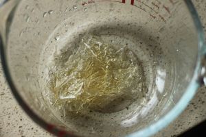 放入泡软的吉利丁片,搅拌直至吉利丁融化,放凉,果冻层的溶液就做成啦;