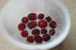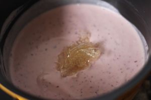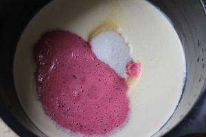 冷冻蔓越莓于牛奶混合后,用料理机搅打成泥;