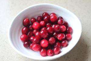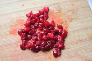 倒入打好的蔓越莓果泥及柠檬汁,小火加热至微沸后离火;