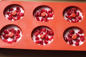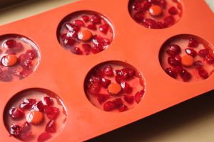 取出后,淋入剩余的蔓越莓奶冻,入冰箱冷藏4小时,成型即可。