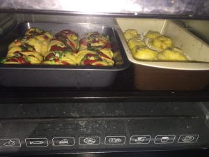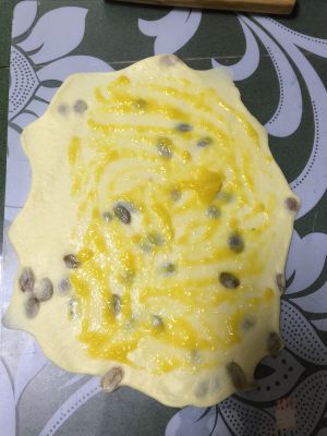 发酵好了,刷蛋液,芝士撕碎,洒葱,挤番茄酱,果酱的刷蛋液,洒酥粒,烤箱预热几分钟,170度烤25分钟,中间上色过深加盖锡纸