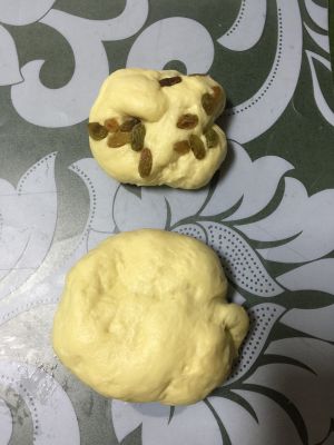 分两个面团,松弛几分钟,1/3做葡萄干果酱面包,2/3做芝士面包