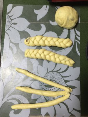 做芝士面包的面团分三份,三个分别编辫子放烤盘里