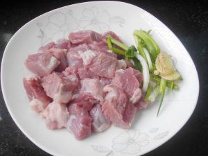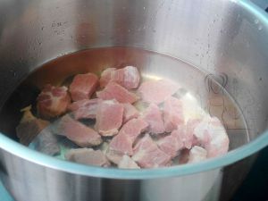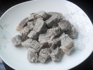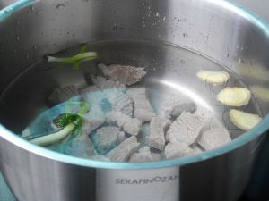 牛肉加入冷水中煮开,加入黄酒煮至酒气消散