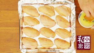 ▲鸡翅腌好了,就可以来准备烤了,烤盘铺上铝箔纸,亮的这面朝上,先刷一层油,然后把鸡翅排好。