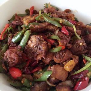 就这种程度,把鸡块捞出。不用清锅放入150克左右食用油,微冒烟放入花椒八角姜片红辣椒爆香,倒入鸡块大火炒五分钟放老抽,再放少许生抽,为了提香也可放点料酒。本人口味比较淡,没放盐。根据个人口味添加。