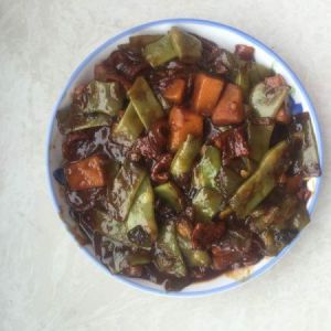 锅热添油,先放肉片,五香粉翻炒,在加入葱姜蒜爆香,加土豆翻炒均匀放豆角,炒到断生加水,粉,蚝油,盐、盖锅盖大火烧开转小火慢炖,最后收汁,加鸡精,味精调味即可……