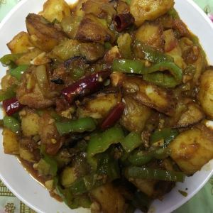 5、将油烧热放入花椒,青椒和西红柿放入油锅炒至1分钟,将烧好的土豆和茄子放入锅中,加入2勺盐、1小勺五香粉,2勺酱油,1勺蚝油,翻炒,炒制均匀,最后放入蒜末,将锅盖盖上焖2分钟,闻到蒜香即可起锅。