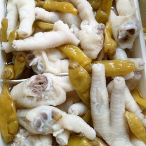 用个干净无油的盒子装上鸡爪,加入泡椒放上少许盐倒入白醋沫过鸡爪,入冰箱冷藏24小时即可
