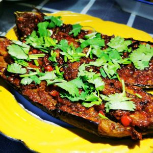 蒜切沫,小米辣、香菜切碎,起锅烧油,炒香蒜末,炒两分钟后盛碗内,加盐,白糖,蚝油,生抽,辣椒酱,豆瓣酱,小米辣搅拌均匀。烤箱盘放锡纸,茄子切开两半,刷油,220度烤四十分钟,拿出来,倒上酱料,涂抹均匀,180度烤十分钟