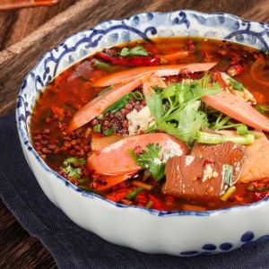 水开之后,先放入五花肉和火腿肠,然后放入鸭血和牛肉,最后放入脆毛肚。毛肚只需要7秒钟,注意时间