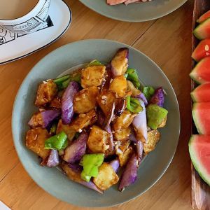 把炸过的茄子和土豆倒进锅里翻炒几下~