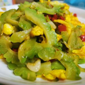 爆香后,放入苦瓜,翻炒,差不多熟的时候,放入炒好的鸡蛋~