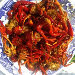 龙虾翻炒至颜色鲜艳倒入火锅底料,料酒少许蒜子继续翻炒