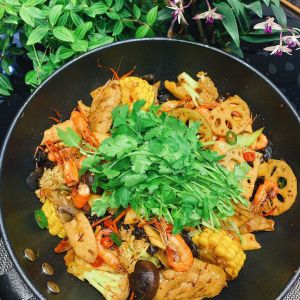 煎鸡翅的油锅内放入火锅底料熬散开 加入盘中的菜至锅中翻炒 拌匀 再加入调好的料汁 再次翻拌均匀 加入香菜 麻辣鲜香的火锅出锅