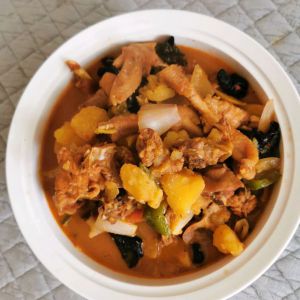倒入土豆翻炒,倒入一罐啤酒、适量开水,水量漫过鸡块。大火煮开,关小火炖30分钟。