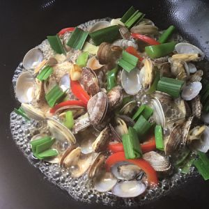 大火烧开,再加入青蒜小段和少许盐,盖上锅盖小火煮会儿,加点味精,可以看到花蛤均己熟就关火。装盘即可。