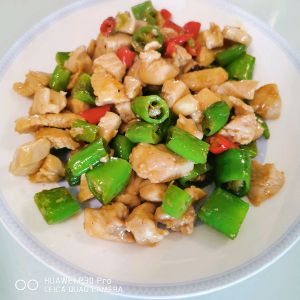油锅热了先放葱姜蒜炝锅,然后倒入辣椒,炒出辣椒香味,约2-3分钟,再倒入腌制好的鸡肉,快速不断煸炒,此时因为有淀粉缘故可能会略有点粘锅,迅速倒入1勺海鲜酱油,改小火,继续煸炒,再加入1g盐,待水沫子炒干鸡肉完全变色即可出锅了!