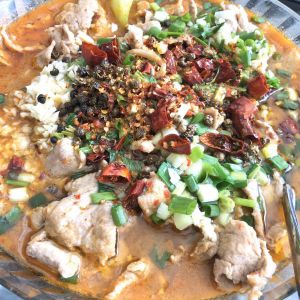 碗顶放干辣椒段,麻椒小香葱,热油泼一下成功