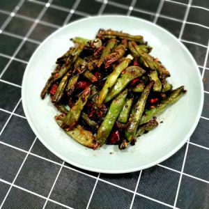 将四季豆炒熟,变得微焦,准备放入干辣椒。