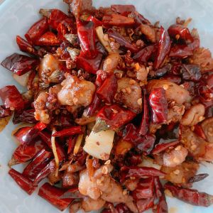 接着放入炸好的鸡块,鸡块吸收了麻辣的香味后,撒点点糖,拌炒几下即可出锅啦