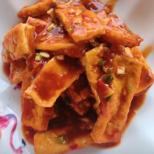 锅中热油放葱蒜爆香放入煎好的豆腐倒入料汁翻炒均匀大火收汁