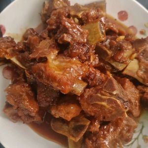 倒入排骨,上色即可,加入蒜碎,翻炒一分钟,倒入一勺料酒,两勺醋,三勺生抽,翻炒一分钟,加入高压锅剩的蒸排骨的汤,大火收汁即可