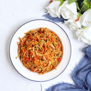 锅中清水煮沸,倒入半勺食盐和几滴食用油,倒入胡萝卜丝,焯至变色捞出过凉水,滤干水分备用;