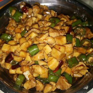锅里留底油,放入花椒,出香味后捞出花椒,放入蒜末干辣椒,放入一勺豆瓣酱,炒出红油,爆香放入杏鲍菇丁,炒熟后放入炒好的鸡腿丁和杭椒,翻炒后放入调好的料汁,翻炒一分钟出锅即可