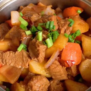 锅中加油,放葱姜爆香,依次加入土豆,胡萝卜,洋葱,牛腩翻炒,加入适量白糖