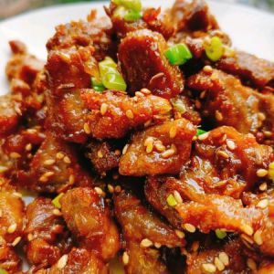 起锅烧油,油热放入提前切好的葱末,姜末爆香,加入孜然粒,再加入炸好的羊肉,翻炒,加入蚝油,孜然粉,白芝麻,稍许盐,(吃辣椒的加入辣椒粉)翻炒,放入葱末,就可以出锅了
