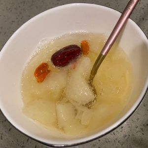 我用的半个雪梨切小块、若羌灰枣、同仁堂枸杞子、冰糖备用,银耳煮到大半个时间的时候把雪梨和大枣扔里一起煮,省最后十分钟放枸杞子和冰糖