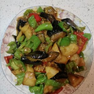 倒入土豆、茄子翻炒,倒入青红椒翻炒,淀粉勾芡倒入锅中迅速翻炒出锅;(›´ω`‹ )