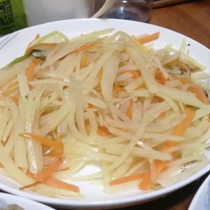 将土豆丝和胡萝卜下锅翻炒,待土豆丝变得剔透时加入适量白米醋继续翻炒即可出锅