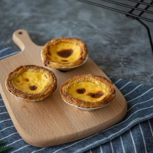 将葡式蛋挞皮放在烤盘,将葡挞液倒进葡挞内,约8成满即可。