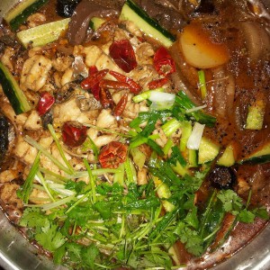 鱼汤烧开后依次加入焯过水的豆芽、白萝卜、豆腐泡。再次烧开后加入鸭血。加入鱼肉。快要起锅的时候加入黄瓜,最后关火。倒入脸盆,放入香菜、辣椒、泡椒、葱段,浇入适量烧滚的油,一盘水煮鱼就烧好了。
