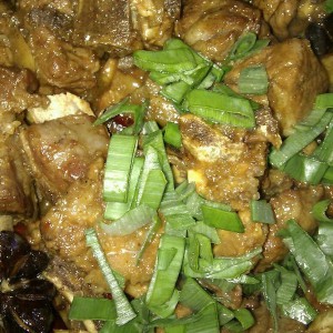 倒入酱油上色,翻炒一下,依次把大料葱姜蒜放入,继续翻炒,加入料酒,最后加入没过排骨的开水,盖上锅盖小火炖40分钟,加入盐,转中大火收汁,哦了,盛出装盘,撒点葱花点缀
