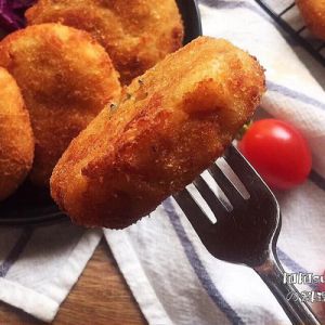 锅里倒入适量的植物油(起码能没过可乐饼),待油里持续冒小泡泡时,转中小火,依次将可乐饼炸成深一点的橙色,铲起沥干即可食用。