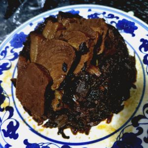 之后把炒好的梅干菜铺在五花肉上。倒扣一个盘子,或用保鲜膜封住上锅蒸一个半小时。